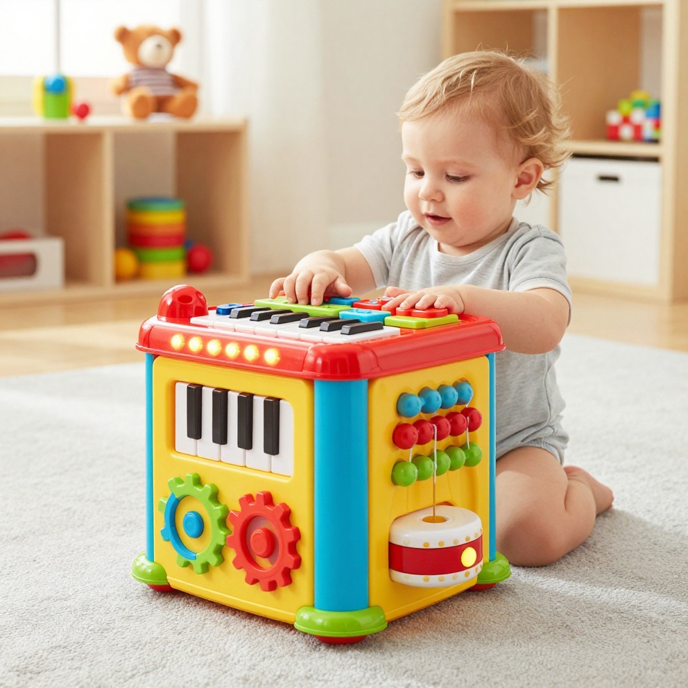 The ToyBoom Musical Activity Cube engages toddlers with five sides of interactive play. Each side offers a different activity: piano keys, spinning gears, animal shape sorters, a bead maze, and a light-up drum. With over 20 sounds, melodies, and phrases, the cube introduces colors, numbers, animals, and cause-and-effect relationships. The cube is lightweight, portable, and designed for floor play or tabletop use.